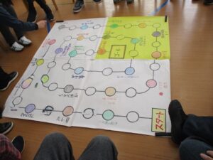 止まったマスでは掛け算・足し算をしたり、魚・鳥・野菜の名前を言うなどデイケア職員お手製のすごろくです。