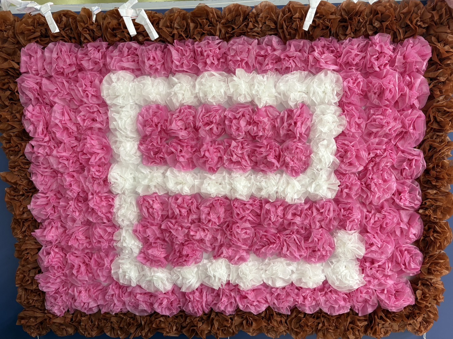 リハビリテーション課では今年の干支である「巳」を約160個のお花紙3色(白・ピンク・茶)で作成しました