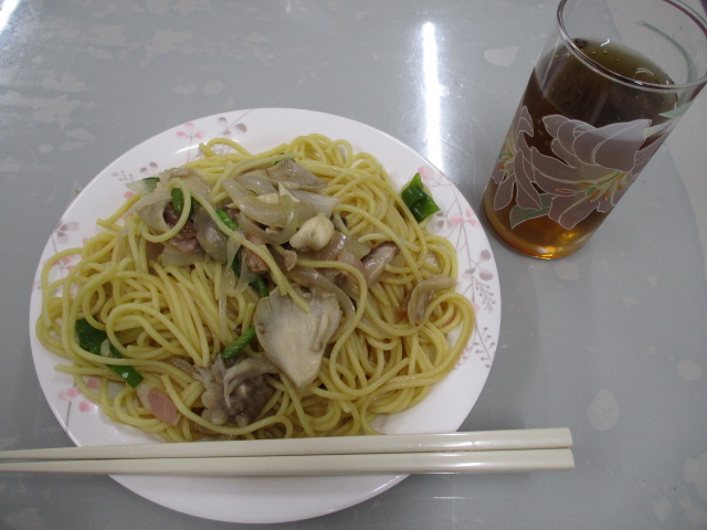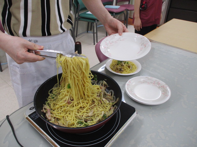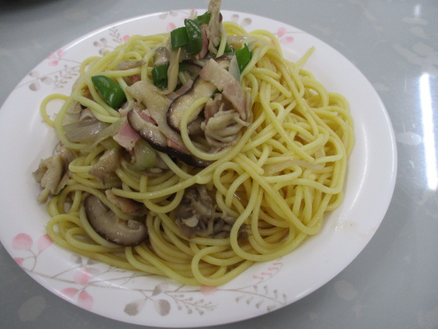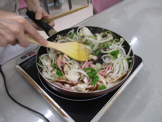 リハ課の料理教室「玉ねぎ・しいたけ・ペーコン・ピーマン」など入った和風きのこパスタを作りました